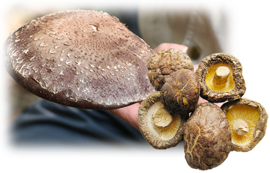 コナラやクヌギの木は20年育てないと一人前の木とは言えません。 ですから山のクヌギの木は20年に一度の割合で木を切っていきます。だから、広いクヌギの山林が必要になるのです。そして原木に毎年種菌を植え込み、古い原木と常に取替え新しくしていかないといけないのです。 原木栽培は、高地の昼夜の温度差がとても厳しい環境にあります。実はこの温度差がしいたけを肉厚にし、おいしくさせるのです。 日中は30度を超え、しいたけは乾燥し、夜になって冷えてくると空気中の水分を吸って成長します。 その厳しい栽培条件を耐え抜いたしいたけは、見事な肉の厚さと、歯ごたえプリプリ、野性的な天然しいたけに近いダイナミックな味のしいたけに成長します。重い原木を扱い重労働でありますが、新鮮なキノコ栽培の基本となっています。独自の“乾燥方法”で、他では出せない旨味と風味を引き出しています。
