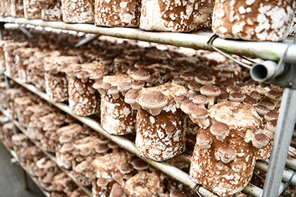 菌床栽培は、10年ほど前から始まった方法で、オガコに水と米ぬかなどの栄養剤を加えて固めたものに種菌を接種し、3ヶ月ほど空調設備などを備えた施設内において菌を蔓延させてからしいたけを発生させます。色や形が一定で味もマイルドという特徴があります。