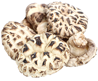 冬菇より薄く、椎茸の輪が回っており、傘が完全に開ききってしまわないうちに取るものです。冬菇に比べて椎茸の香りが強く、旨味と香りを持っていますので、輪が回っているので見た目としても良くおせち料理などで使用されております。