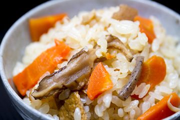 3.炊飯器に米、炊き込みご飯のもと、 2の乾しいたけを加えて炊く
